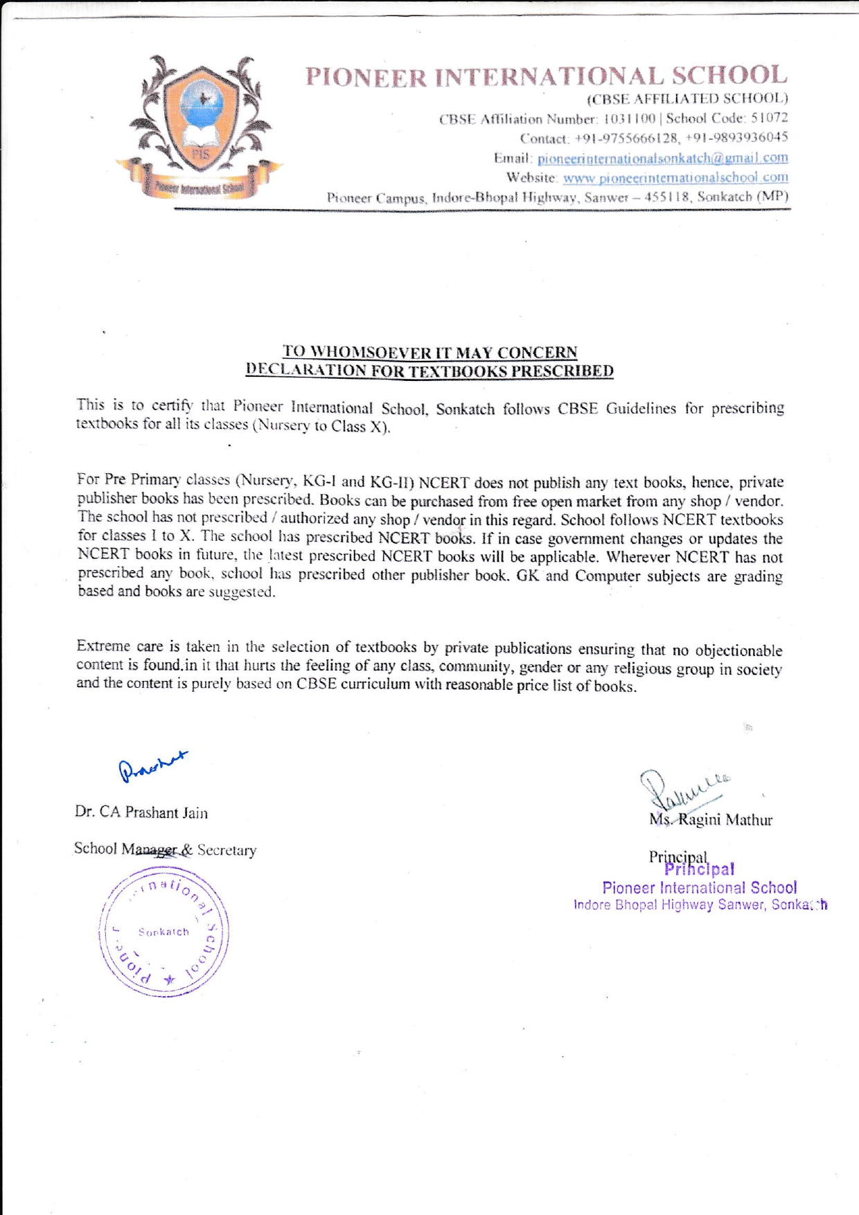 Declaration about school text books